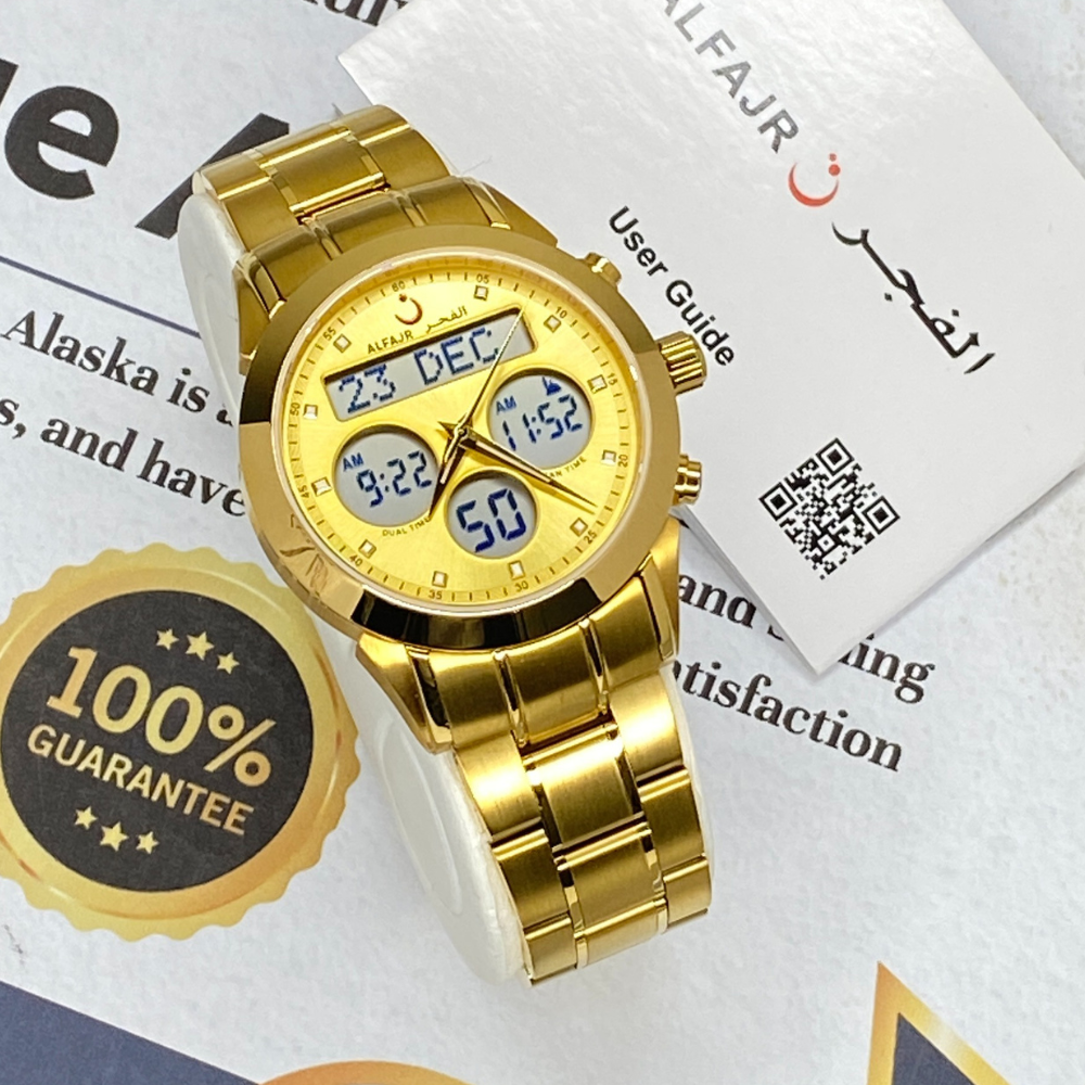 Al Fajar Original Men’s Stainless Steel Dual Time Watch with Azan Prayer Alarm Qibla Direction and Hijri Calendar